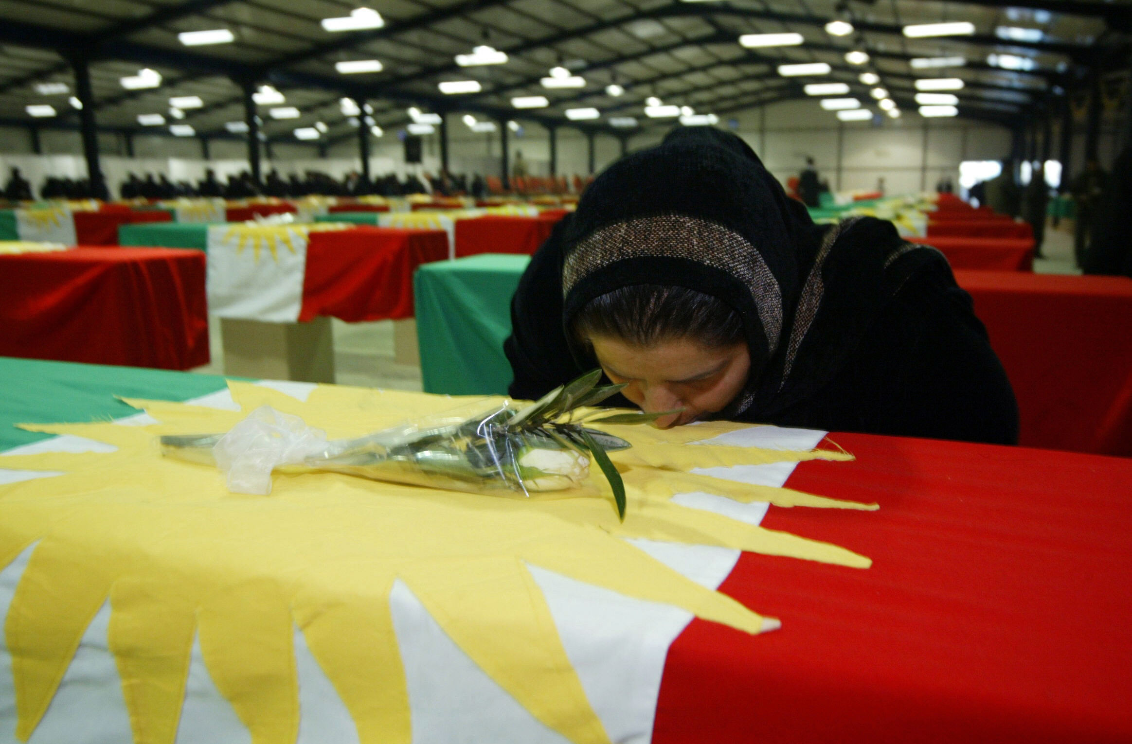 En kurdisk irakisk kvinna sörjer vid en minnesceremoni av 371 offer, 20 år efter folkmordet ägt rum. Foto: AFP PHOTO/Safin Hamed