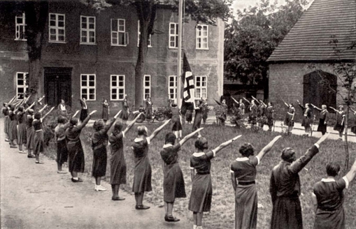 Den nazistiska flaggan hissas på en tysk flickskola medan flickorna hälsar flaggan med nazisthälsningen. Foto: Yad Vashem