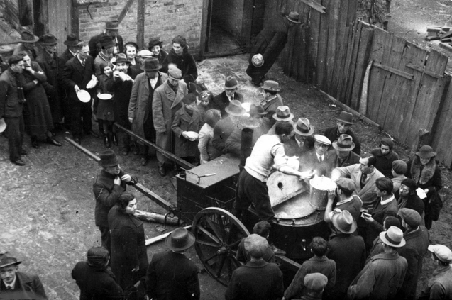 Deporterade judar i Zbaszyn väntar i en matkö. Foto: Yad Vashem