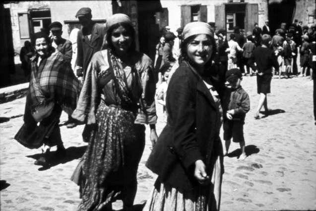 En grupp romer väntar på order i Belzec koncentrationsläger. Foto: USHMM