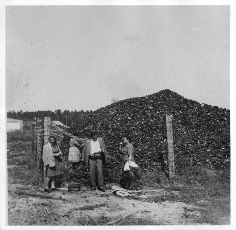 När massmorden var genomförda återstod bara ett berg av skor vid koncetrationslägret Stutthof. Före detta fångar står framför berget av skor sedan de befriats vid krigsslutet. Foto: Yad Vashem
