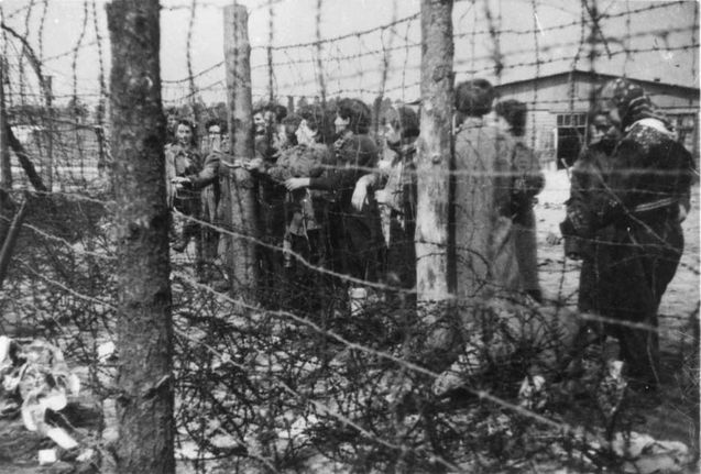 Bilden visar ett femtontal kvinnor ståendes nära taggtrådsstängsel.