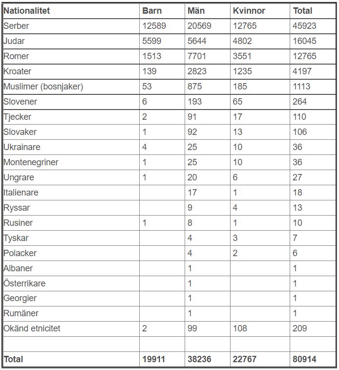 Dödade i koncentrationslägret Jasenovac, 1941–1945 enligt etnicitet, kön och ålder. Uppgifter hämtade augusti 2011 från källa: Javna ustanova spomen-područje Jasenovac