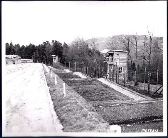 Bilden visar stängsel och vaktpostsbyggnader i trä.