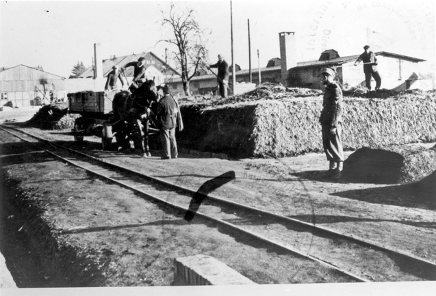 Bilden visar häst med vagn och män som lastar ur, övervakad av soldat.