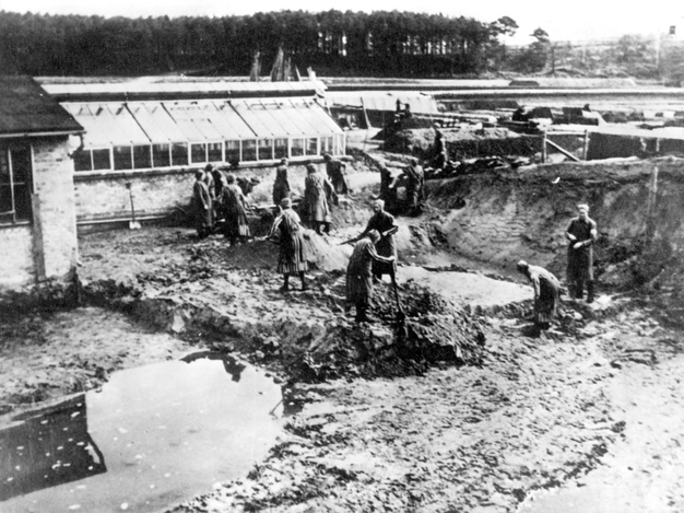 Bilden visar ett tiotal kvinnor i randiga klänningar och förkläden med spadar i händerna, övervakade av soldater.