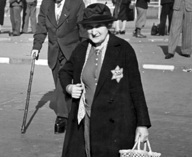 Bilden visar dam i hatt med sjärna med texten jude skrivit mitt på fäst på kappan.