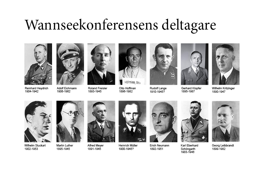Den 20 januari 1942 sammankallades ett möte med syftet att dra upp riktlinjer och samordna organiseringen av massmordet på Europas judar. Bildmontage av deltagare på konferensen: Peter Pettersson