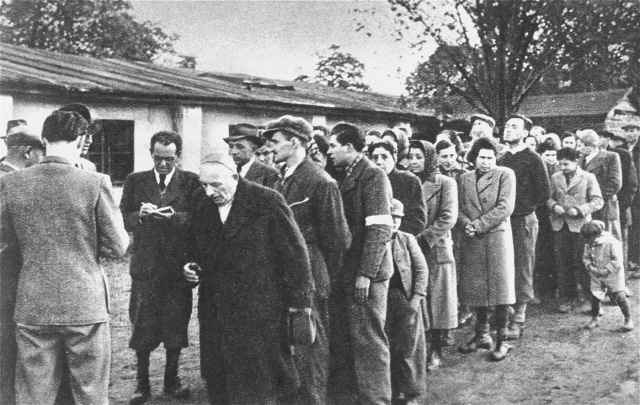 Bilden visar kvinnor och barn som valts ut för avrättning i gaskamrarna gå på led möt döden i Auschwitz