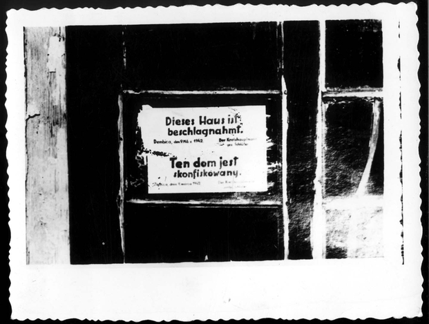Precis som i andra områden kontrollerade av tyskarna beslagtogs judisk egendom i Polen. Här en entrédörr till ett judiskt hus i Debica med ett anslag som berättar att "Detta hus är konfiskerat". Foto: Yad Vashem