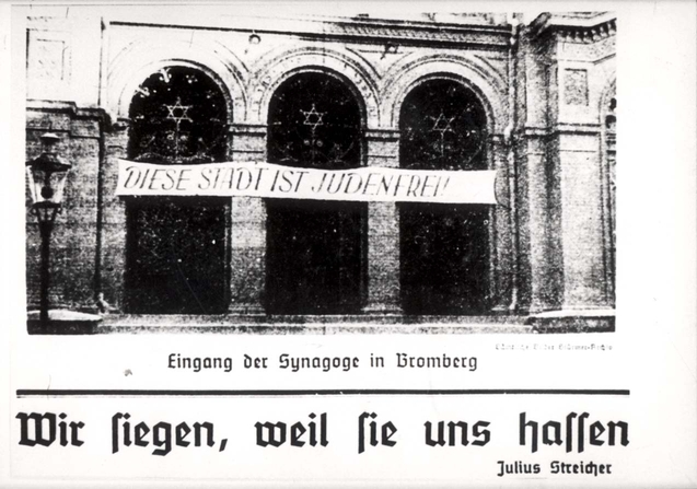 Vid ingången till en synagoga hänger en banderoll med texten ”Denna stad är judefri”. Foto: Yad Vashem