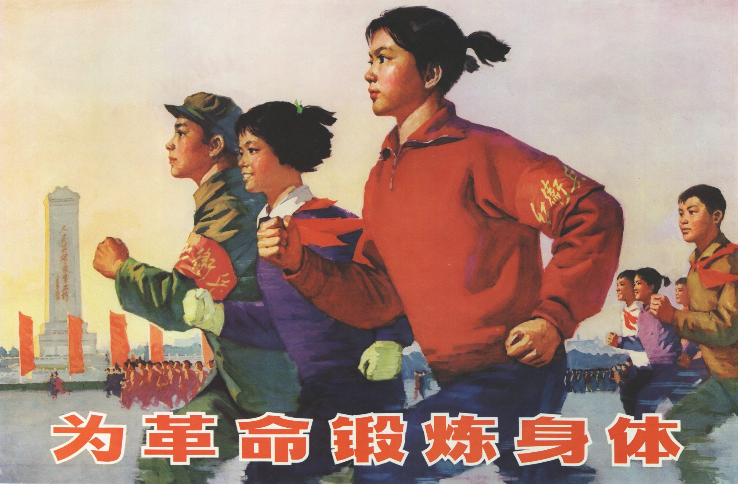 En målad kinesisk prograganda-affisch med springande ungdomar på.
