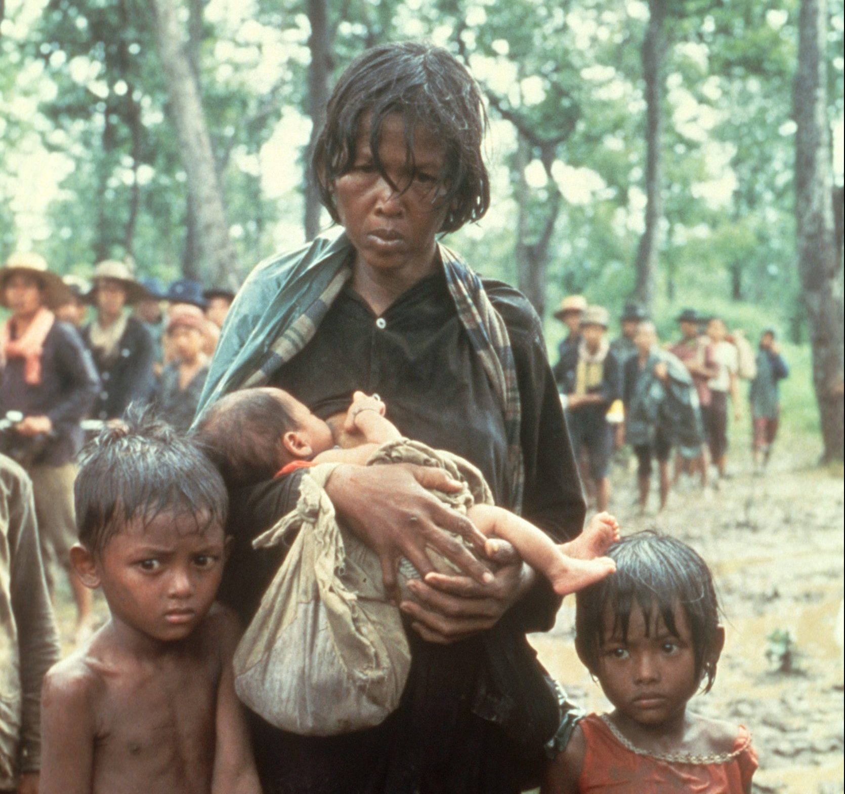 Nära den thailändska gränsen vandrar tiotusentals khmerflyktingar i skogen mot Thailand för att undkomma svält. Denna mamma bär på sitt spädbarn som föddes i skogen flera dagar tidigare. Foto: Roland Neveu/LightRocket/Getty Images