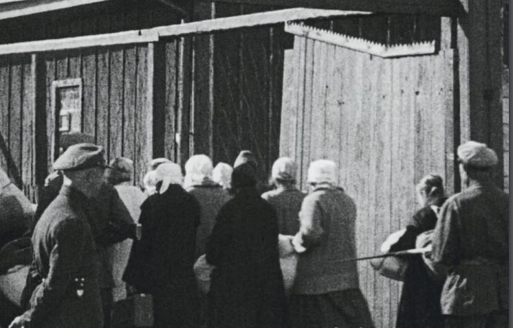 En grupp fångar förs in i lägret av vakter med vapen. På skylten över porten, står texten ”Förvaltningen av lägret Solovetsky för särskilda syften”. Foto: Gulag archives/Tomasz Kizny