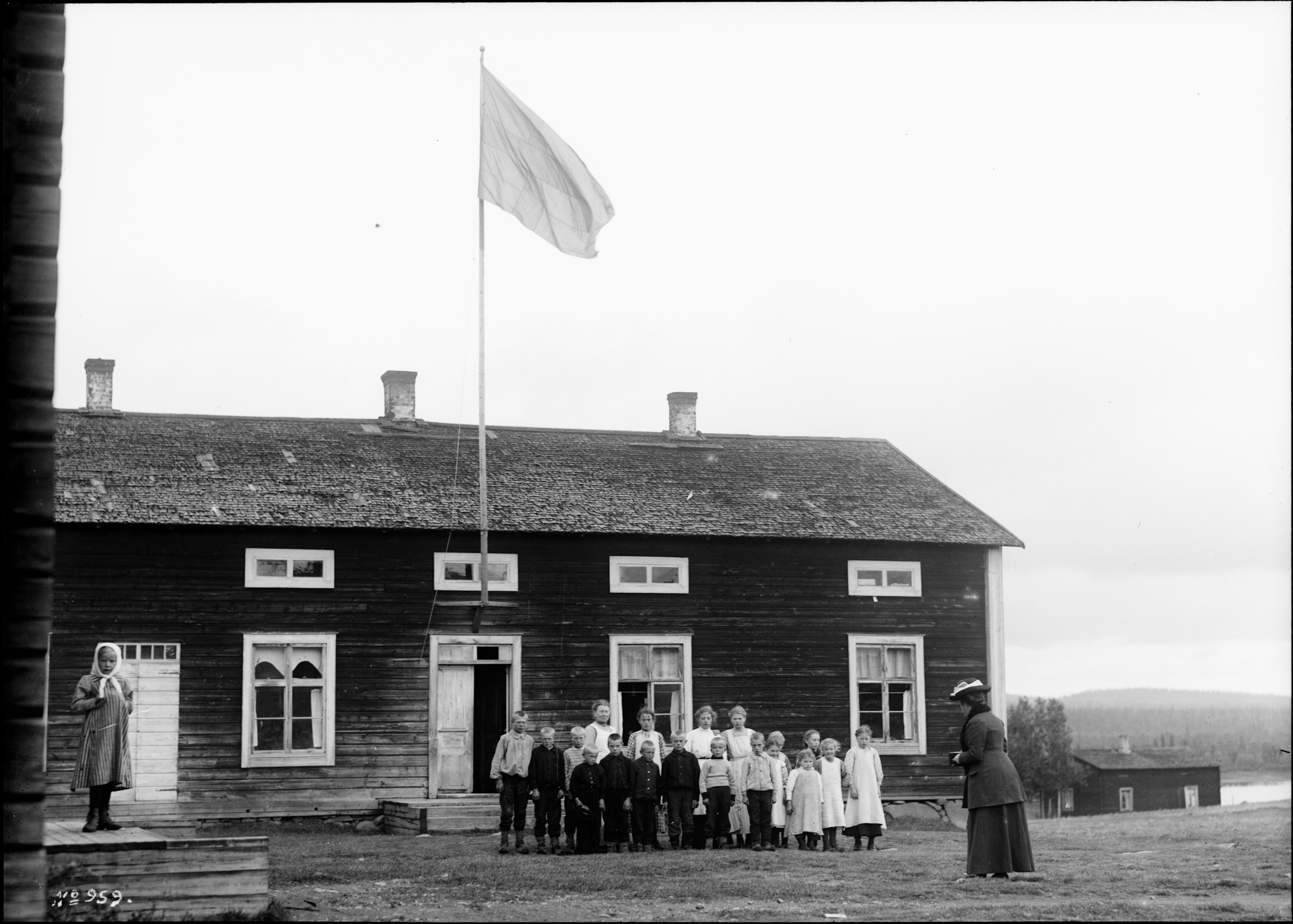 Barngrupp vid arbetsstuga i Korpilombolo år 1913. Bildkälla: Borg Mesch/Kiruna kommuns bildsamling