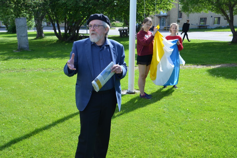 Vid Tornedalens folkhögskola i Övertorneå leddes flaggceremonin på Tornedalingarnas dag 2019 av författaren Bengt Pohjanen som assisterades av barnbarnen Sofia Tegelid och Mirjam Stoltz. Foto: Hasse Stenudd