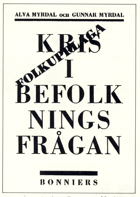 Omslagsbild till skriften ”Kris i befolkningsfrågan”, av Alvar och Gunnar Myrdal. Bildkälla: Wikimedia commons, public domain.