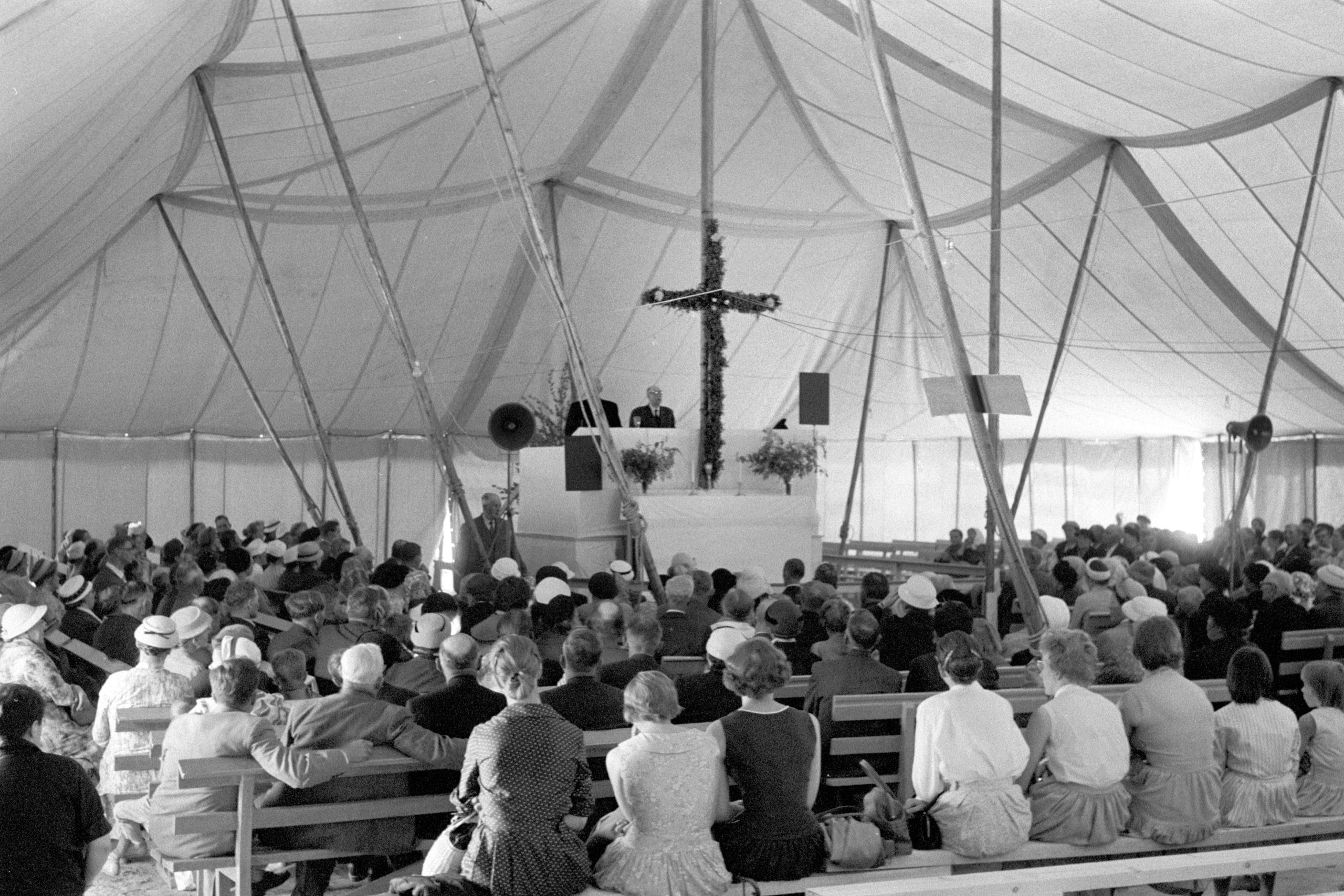 Stormöte i Kalix 27/6 1958. 10 000 personer i Tornedalen hyllar Laestadius. Predikantens finska ordflöde översätts snabbt till svenska. Att bekänna sina synder och få förlåtelse är laestadianismens enkla lära.