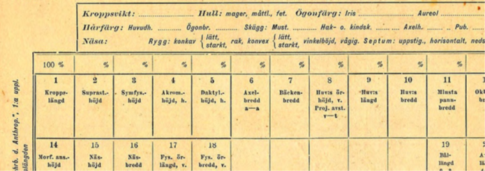 Registerkort för dokumentation av kroppsliga mätdata. Kortet anger de undersökta personernas fysik, hälsotillstånd och sociala status. Bildkälla: Arkiv efter Statens institut för rasbiologi, Uppsala universitetsbibliotek.