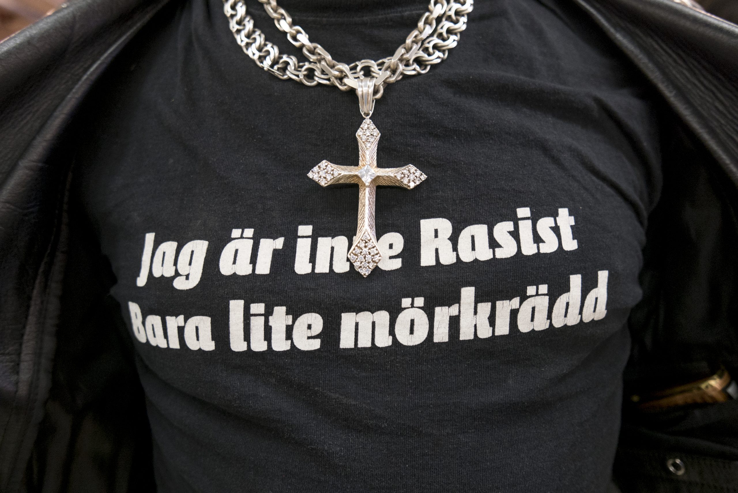 En bringa av en T-shirt med texten "Jag är inte Rasist, bara lite mörkrädd".