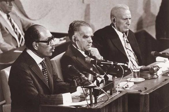 Egyptens president Anwar Sadat håller tal till det Israeliska Knesset I Jerusalem i november 1977. Foto: Wikimedia Commons