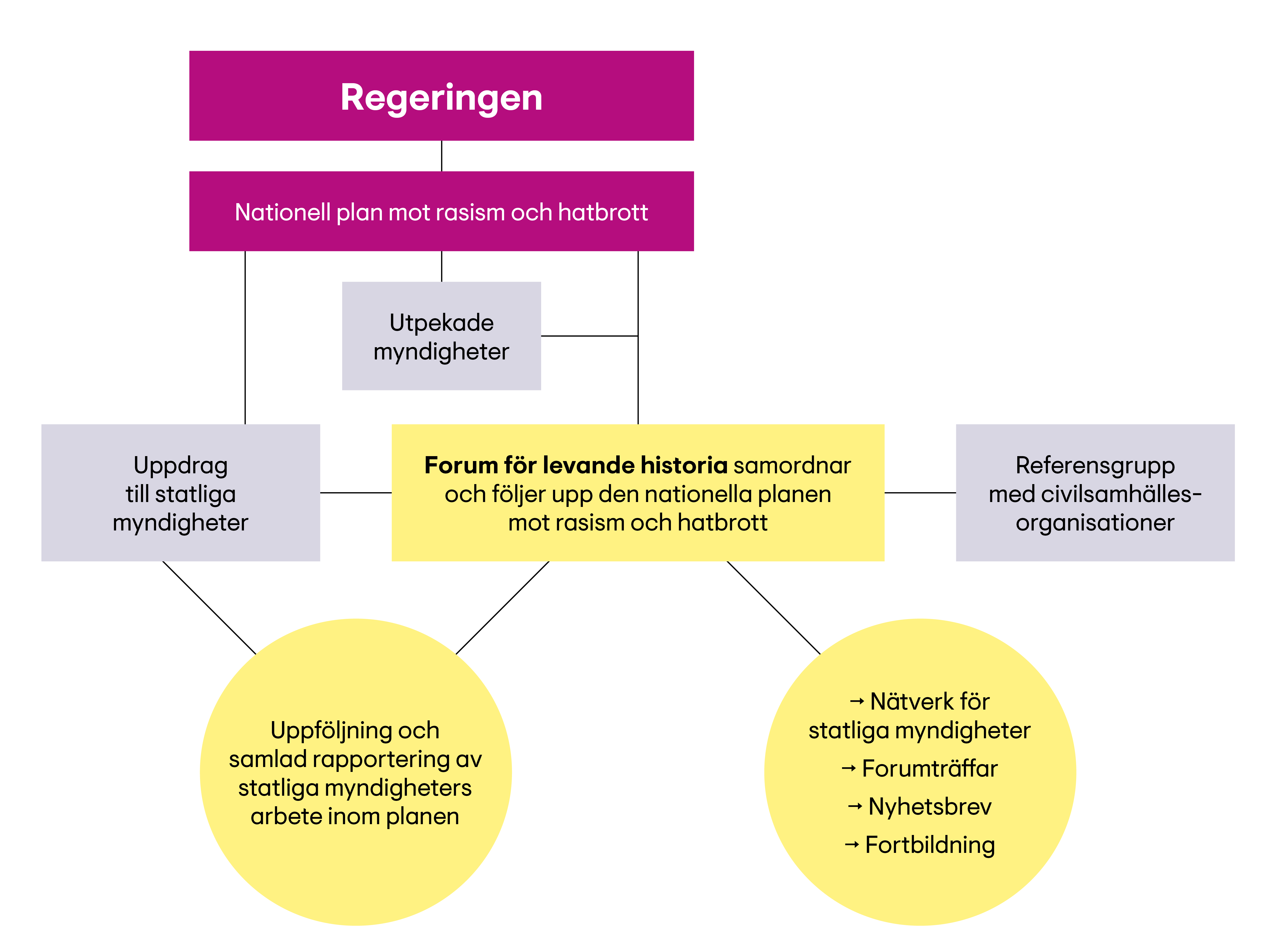 Forum för levande historia ansvarar för att samordna och följa upp hur myndigheter arbetar med sina uppdrag inom ramen för regeringens nationella handlingsplan mot rasism och hatbrott.