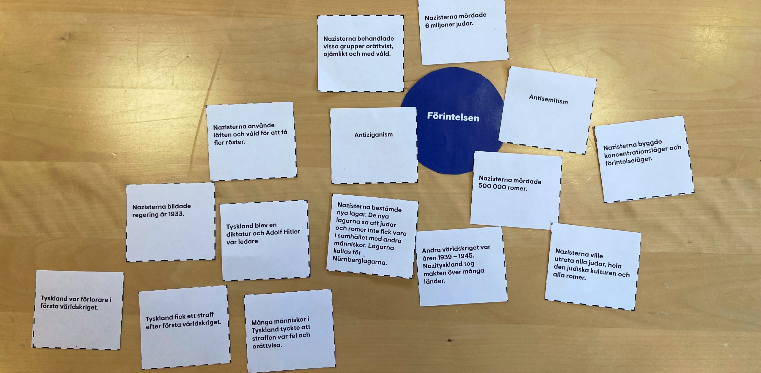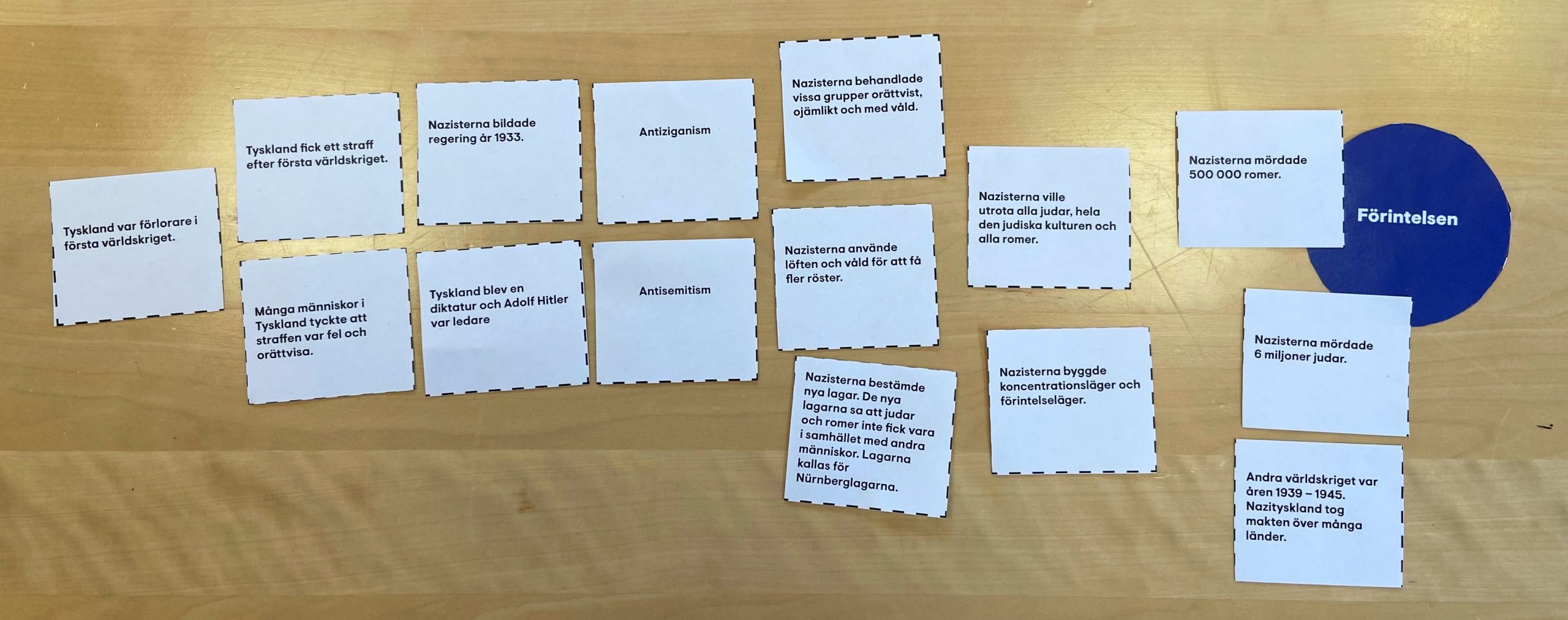 - Be eleverna att rangordna korten – vilka orsaker är nära i tid till Förintelsen och vilka är längre ifrån händelsen? Eleverna behöver inte ha en strikt kronologisk ordning utan mer tänka vad som är nära i tid eller vad som är längre ifrån tid.