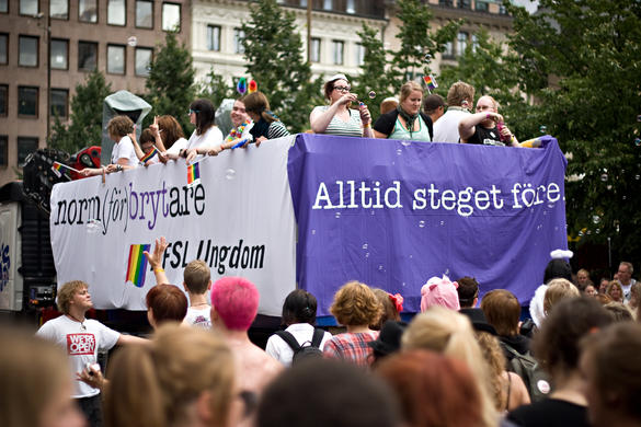 Bilder föreställer lastbilsflak på Stockholm Pride med många människor från RFSL Ungdom