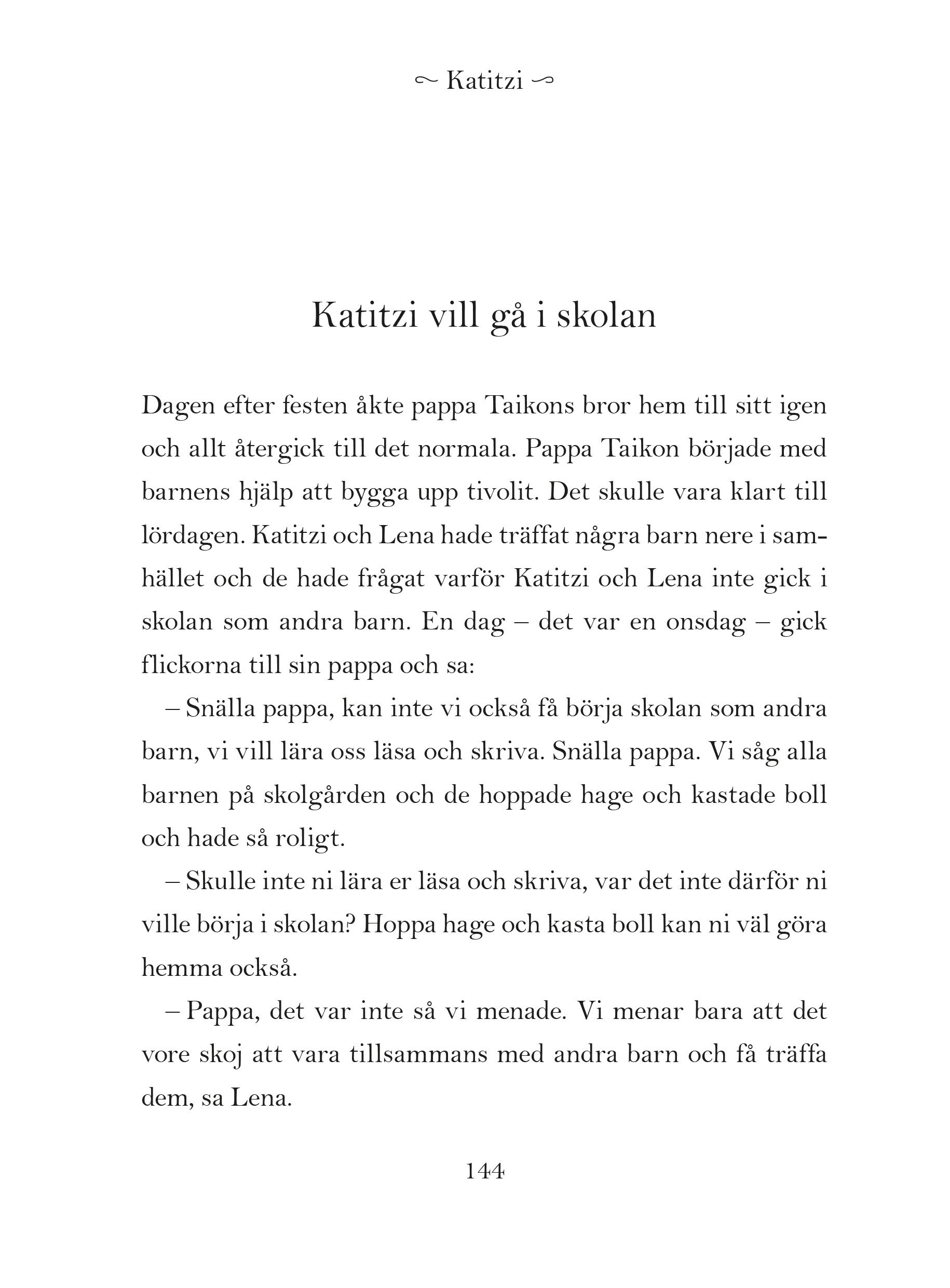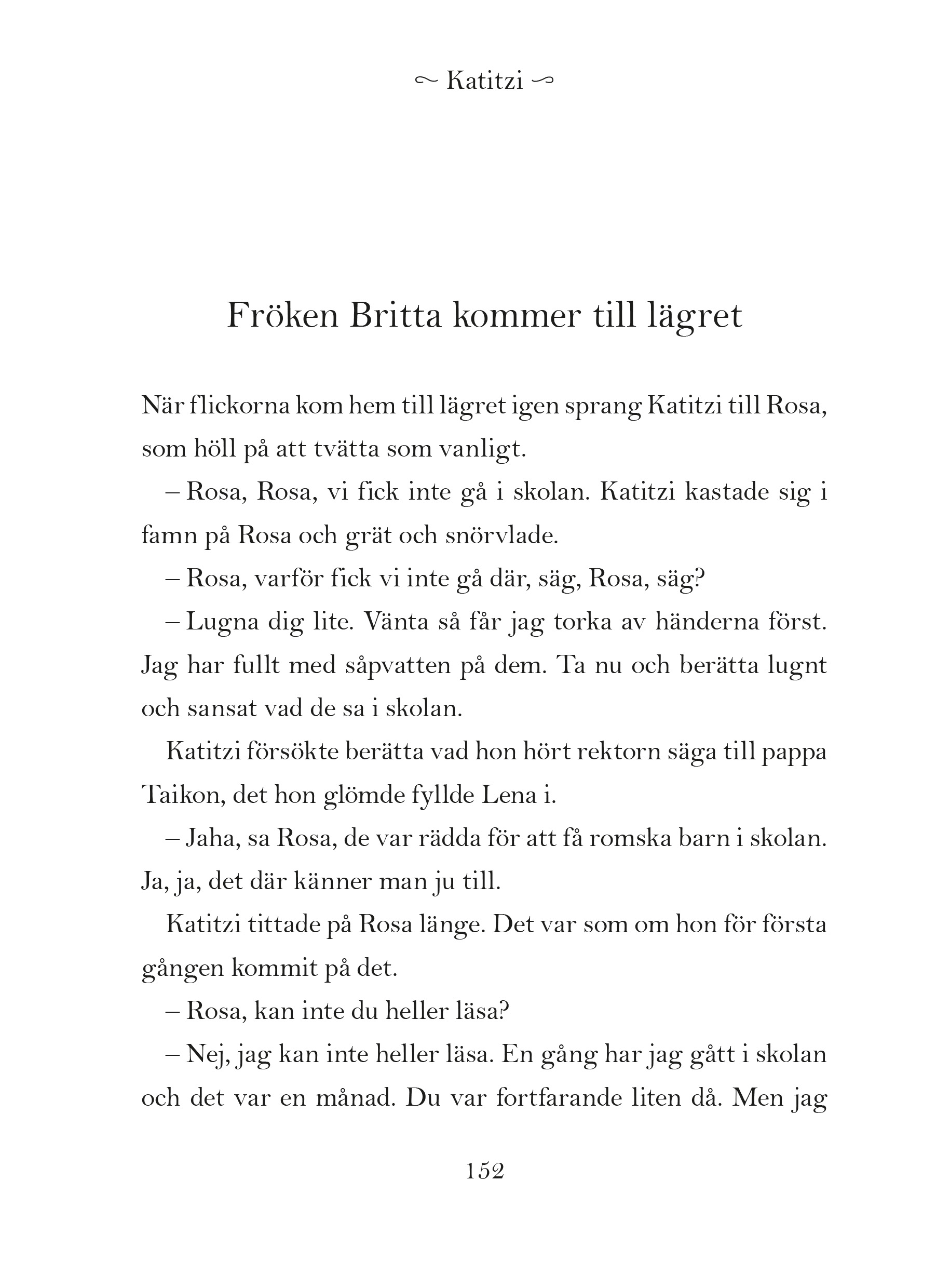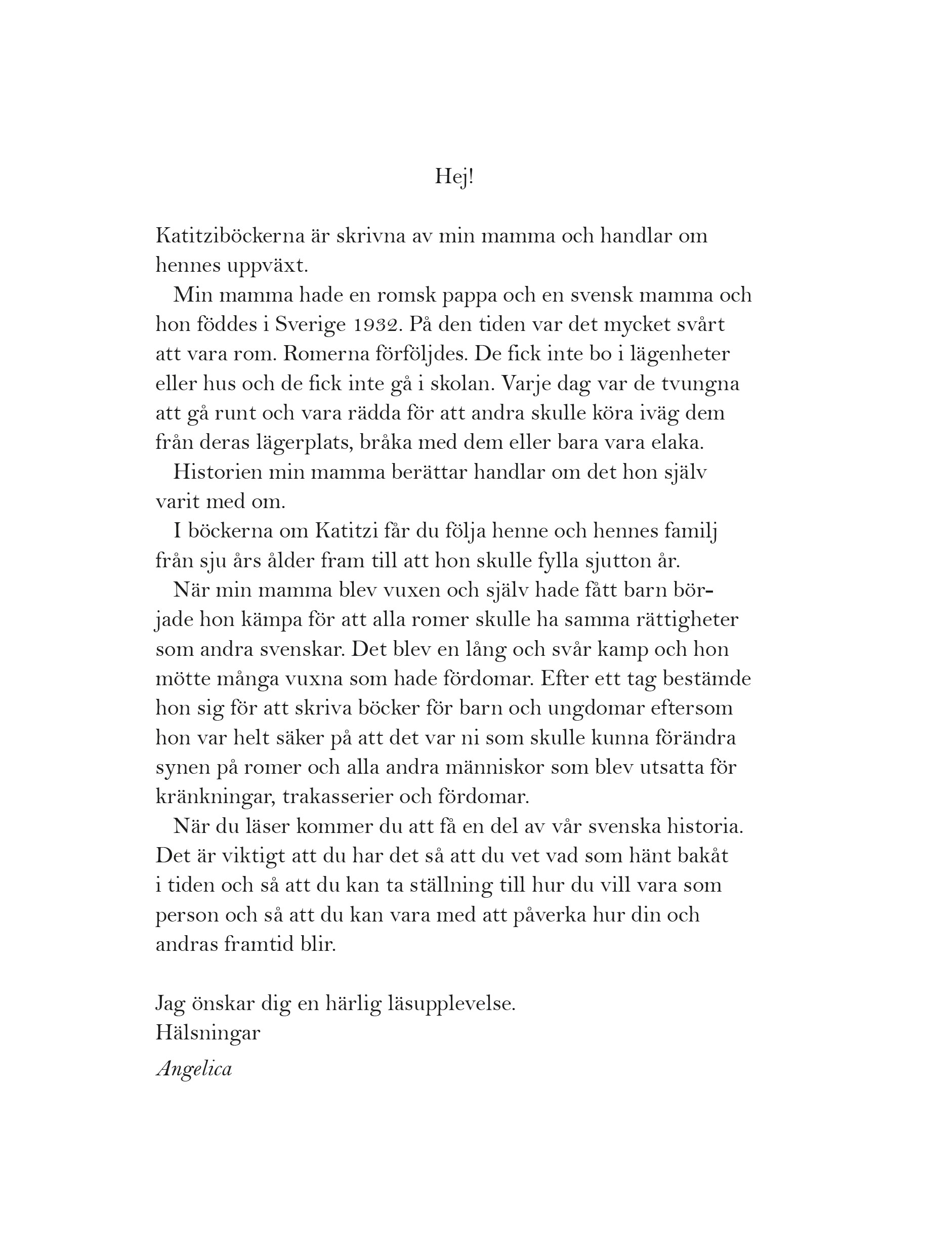 Katarina Taikon föddes i ett romskt läger 1932. Hon blev i vuxen ålder författare och har skrivit 13 ungdomsböcker om den romska flickan Katitzi. Under sin uppväxt flyttade Katarina ofta och varken hon eller hennes syskon hade möjlighet att gå i skolan. Boken Katitzi gavs ut första gång 1969. År 2015 kom boken i en nyutgåva. I den nya varianten hade förlaget Natur och Kultur ändrat vissa ord, lagt till nya illustrationer och ett förord. Katarina Taikons berättelse är dock densamma.