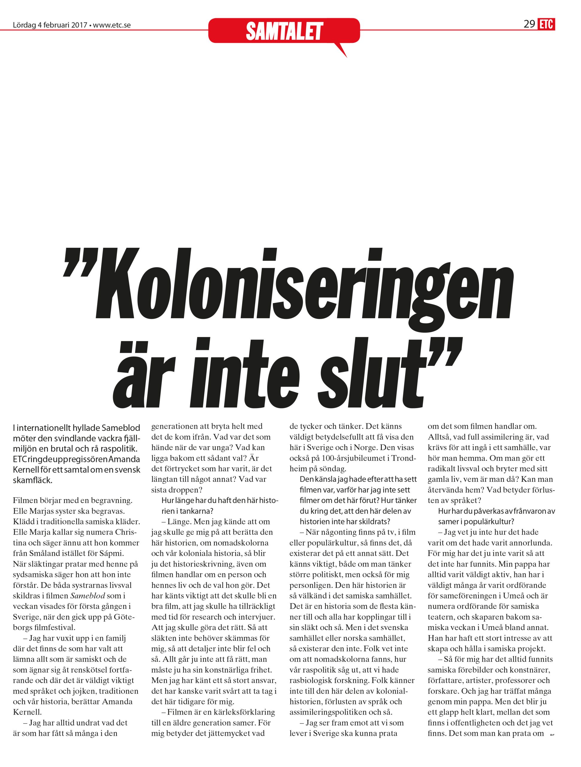 Filmen Sameblod från 2016 handlar om samiska Elle Marja som går i nomadskola tillsammans med sin lillasyster. Elle Marja ska snart ta över som renskötare i familjen. Samtidigt drömmer hon om ett annat liv och att få studera vidare vid universitetet. Filmens skapare heter Amanda Kernell och har själv en samisk bakgrund.