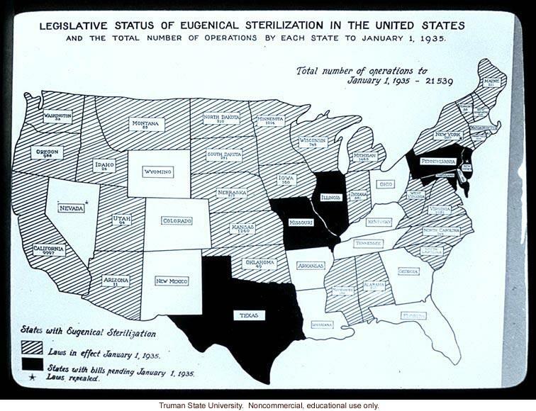 1907 driver den amerikanska delstaten Indiana igenom en lag som gör det möjligt att sterilisera så kallade ”sinnesslöa” individer. Ett trettiotal delstater klubbar sedan igenom liknande lagar. Av de 60 000 personer som tvångssteriliseras i USA (flera hundra tusen personer steriliseras dessutom ”frivilligt”) fram tills 1970-talet utgörs de flesta av fattiga svarta kvinnor och kvinnor från ursprungsbefolkningar.