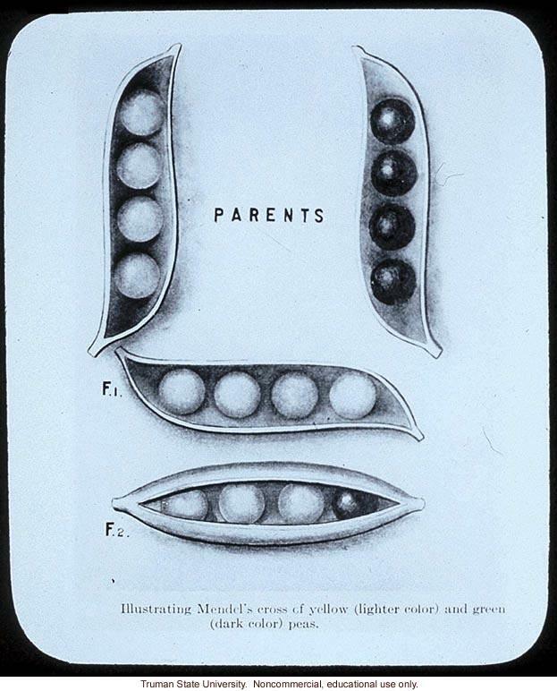 llustration av Mendels korsning mellan gula och gröna ärtor. Bildkälla: The Harry H. Laughlin Papers, Truman State University, Lantern Slides, Black Case, Section 3,221, www.eugenicsarchive.org