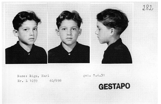 Bilden visar registerkortet med tre porträtt, ett framifrån och två i profil. Kortet är stämplat gestapo.
