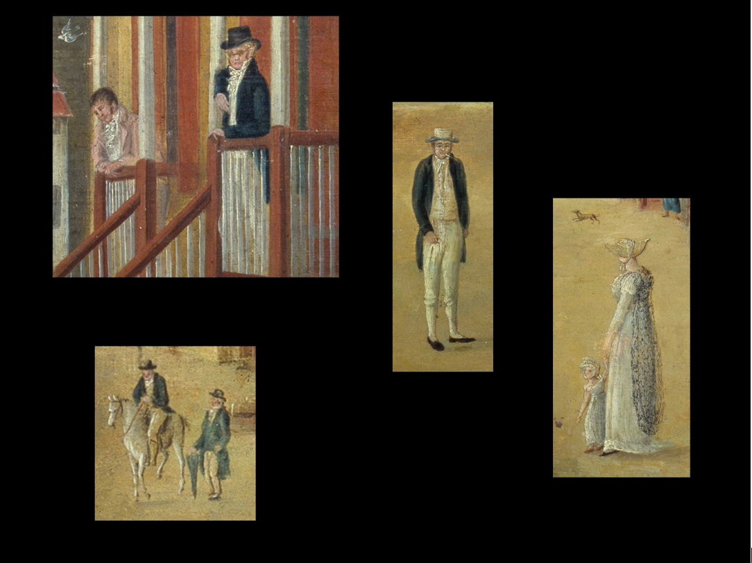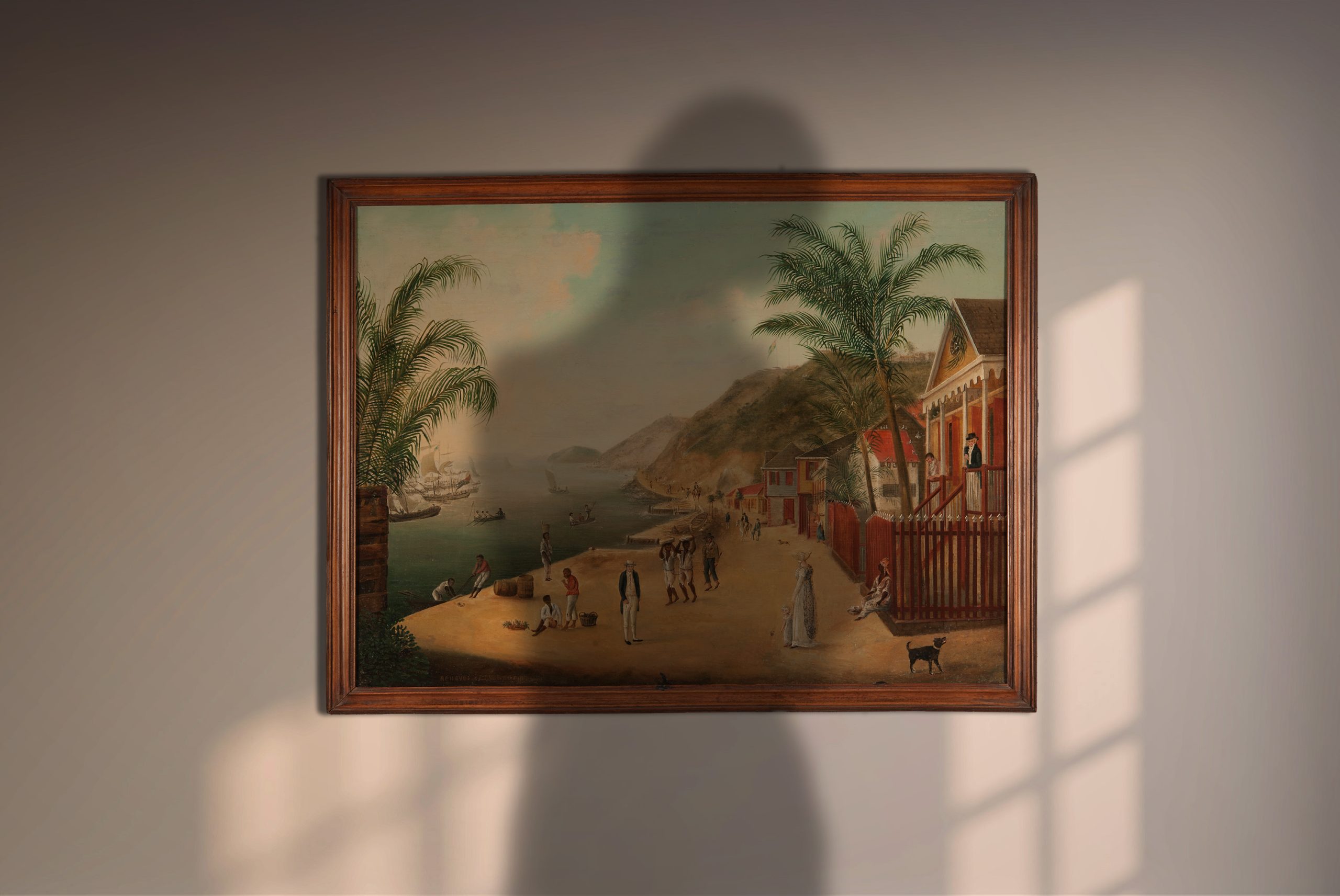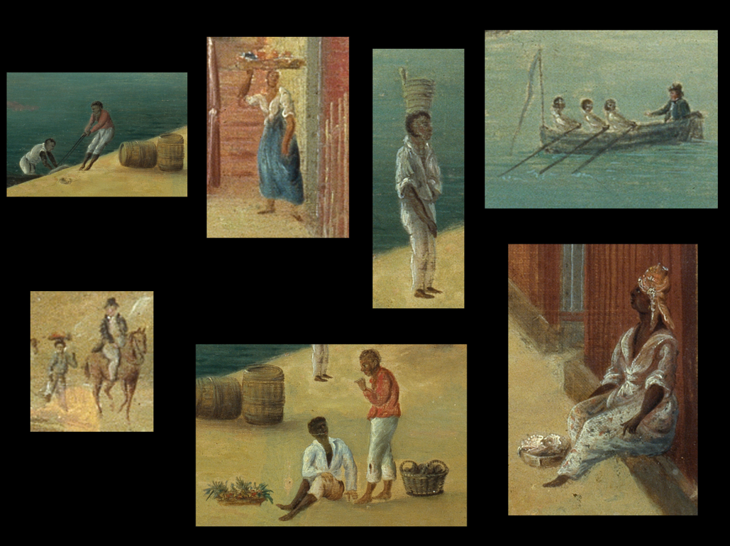 På kajen tar två svarta män en paus, de har korgar med frukt eller grönsaker, kanske är de på väg till marknadstorget för att sälja varorna för deras ägares räkning. Vid sidan av den vite mannen till häst går en svart man som bär på något. Enligt slavlagen var det förbjudet för slavar att rida i staden.