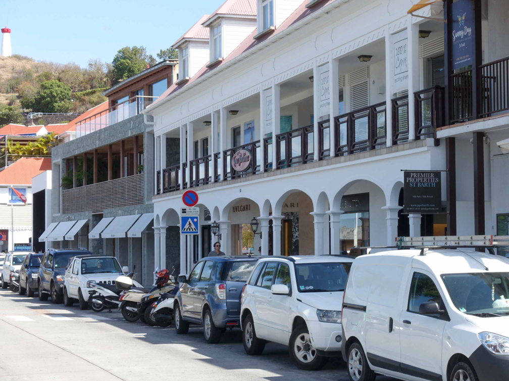 Husen på bilden ligger ungefär på samma plats på kajen där byggnaderna finns på målningen. Det vita fyrtornet i bildens övre vänstra hörn ligger nära där man ser den svenska flaggan på höjden i målningen. På denna gata i Gustavia ligger idag exklusiva märkesbutiker.