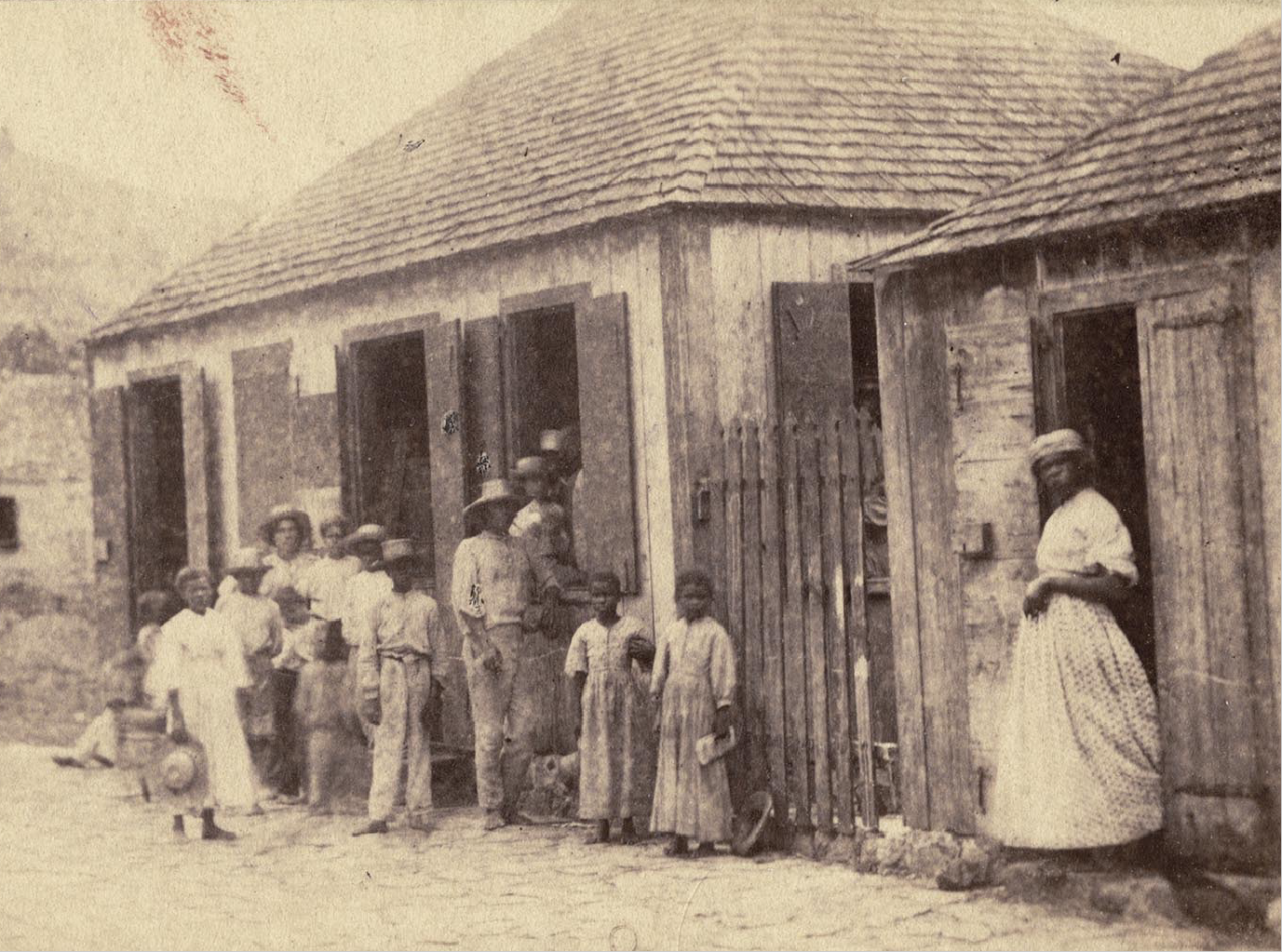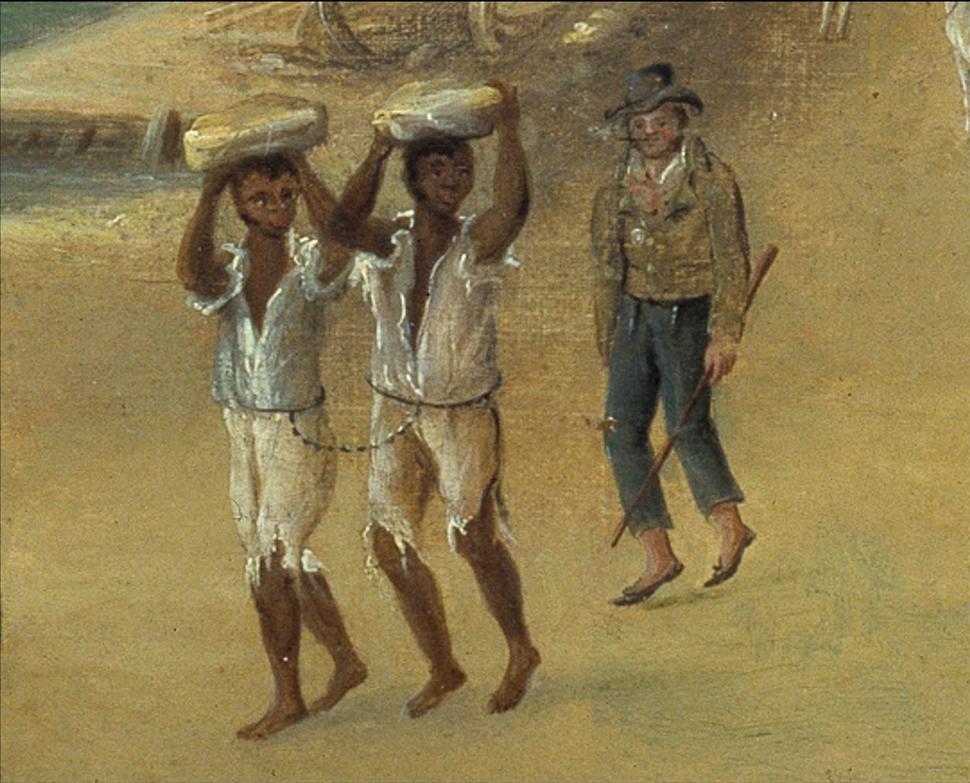 På kajen går två män bärandes något på huvudet. Det är svårt att avgöra vad det kan vara men eftersom föremålet är ganska litet och de använder båda händerna är det antagligen något tungt. När det gäller de andra svarta människorna på bilden kan vi inte avgöra om de var förslavade eller fria svarta, men i detta fall är det uppenbart att de två männen är förslavade människor eftersom de är hopkedjade.