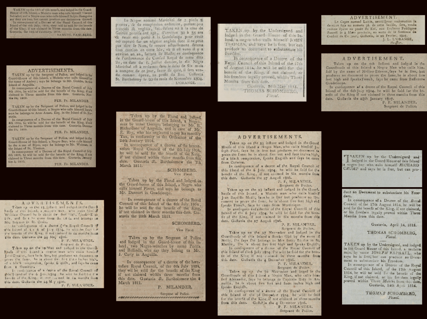 Annonser ur Gustavias tidning som letar efter ägare av fängslade svarta människor som inte kunde bevisa att de var fria. Om ingen ägare kunde bevisa ägarskap såldes personen som slav på auktion.
