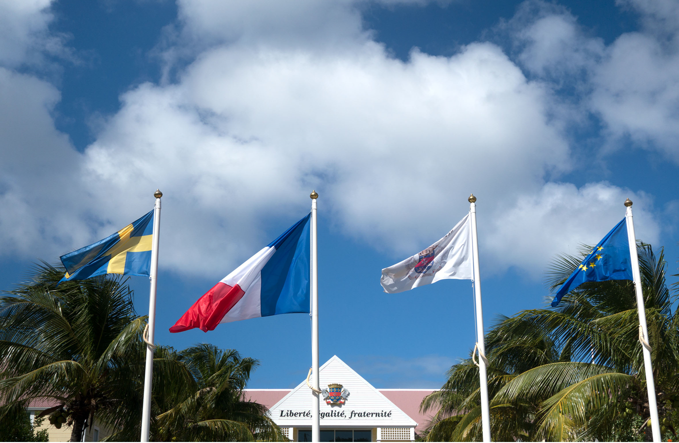 Den svenska flaggan vajar framför S:t Barthélemys stadshus. Det finns byggnader och andra lämningar kvar i Gustavia som påminner om tiden när ön var svensk.