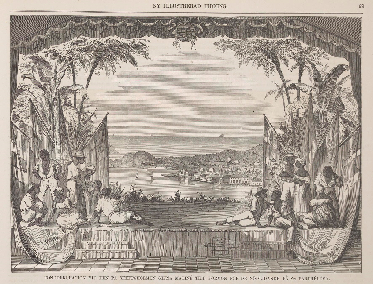 Dekoren vid en välgörenhetsföreställning 1869 för att samla in pengar till S:t Barthélemys befolkning. Arrangörerna visste att speciellt den svarta befolkningen hade drabbats av fattigdom. Alla människor som avbildades i föreställningens dekor var svarta. Bildkälla: Ny Illustrerad Tidning
