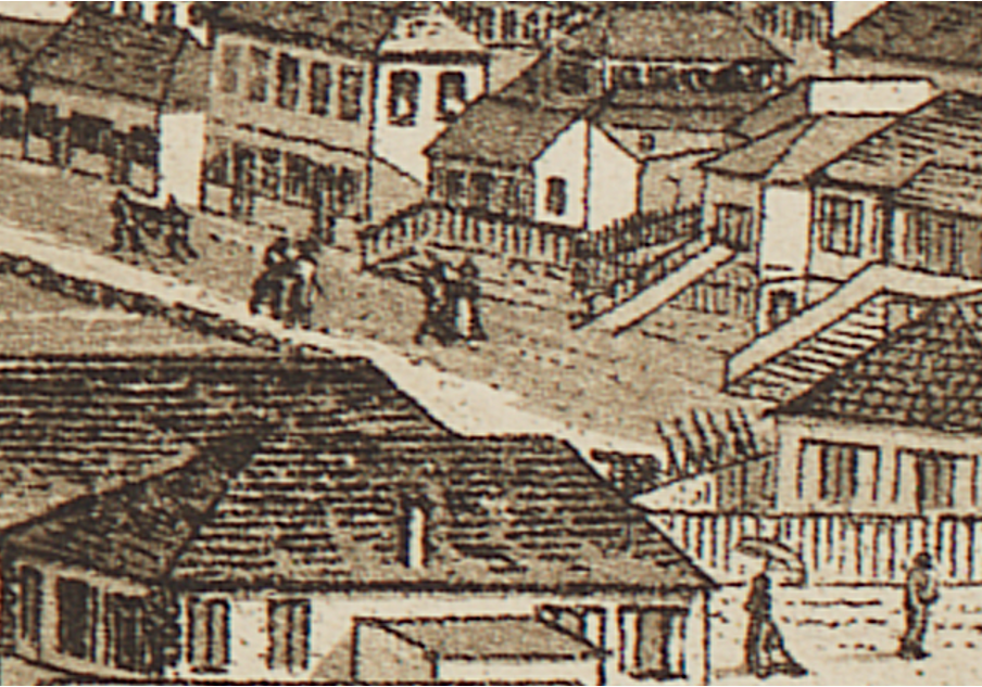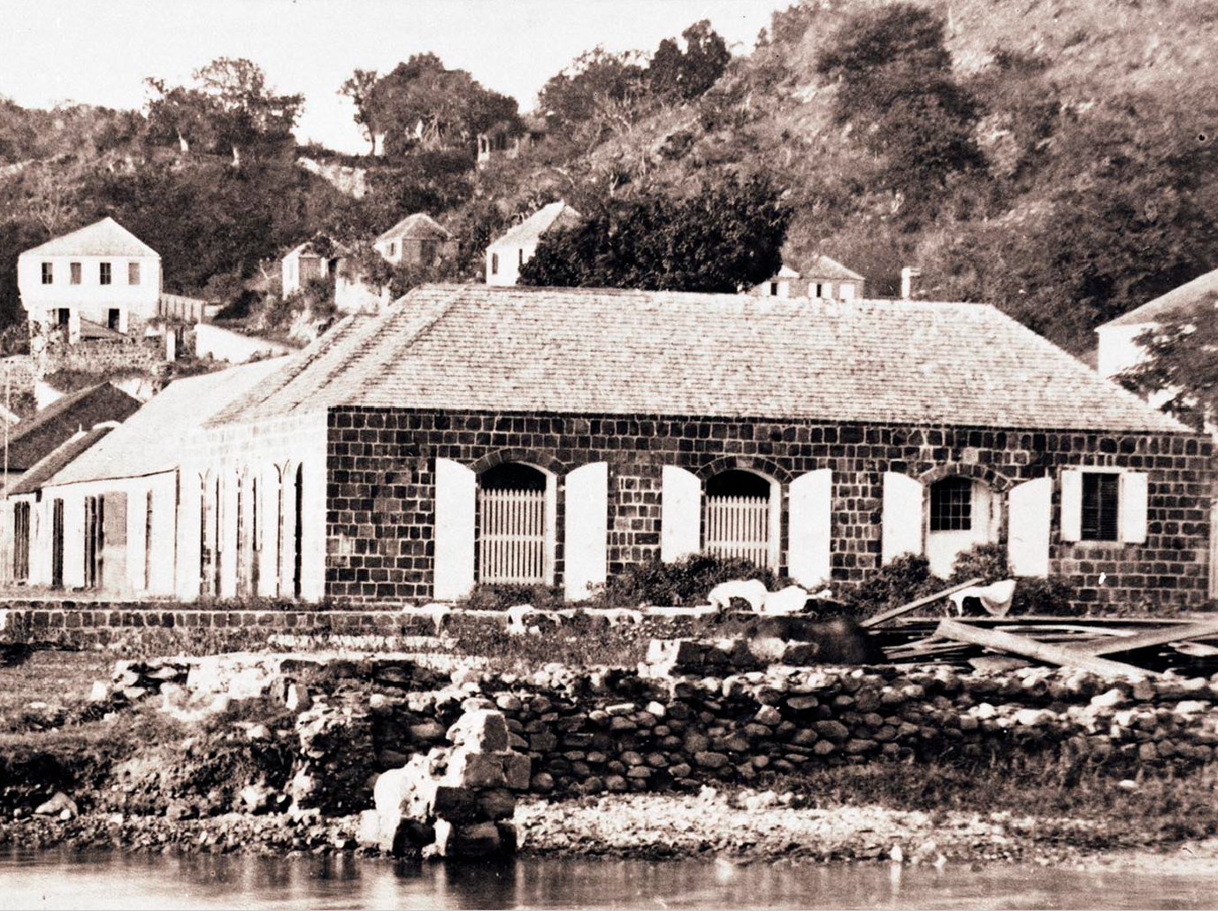 Hamnmagasinet i Gustavia var innan det revs känt som ”slavhuset”. Det användes möjligen som fängelse för fångar som lastades av på S:t Barthélemy inför försäljning. Bild från 1860–70-tal, fotograf Carl Constantin Lyon, Statens Maritima Museer.
