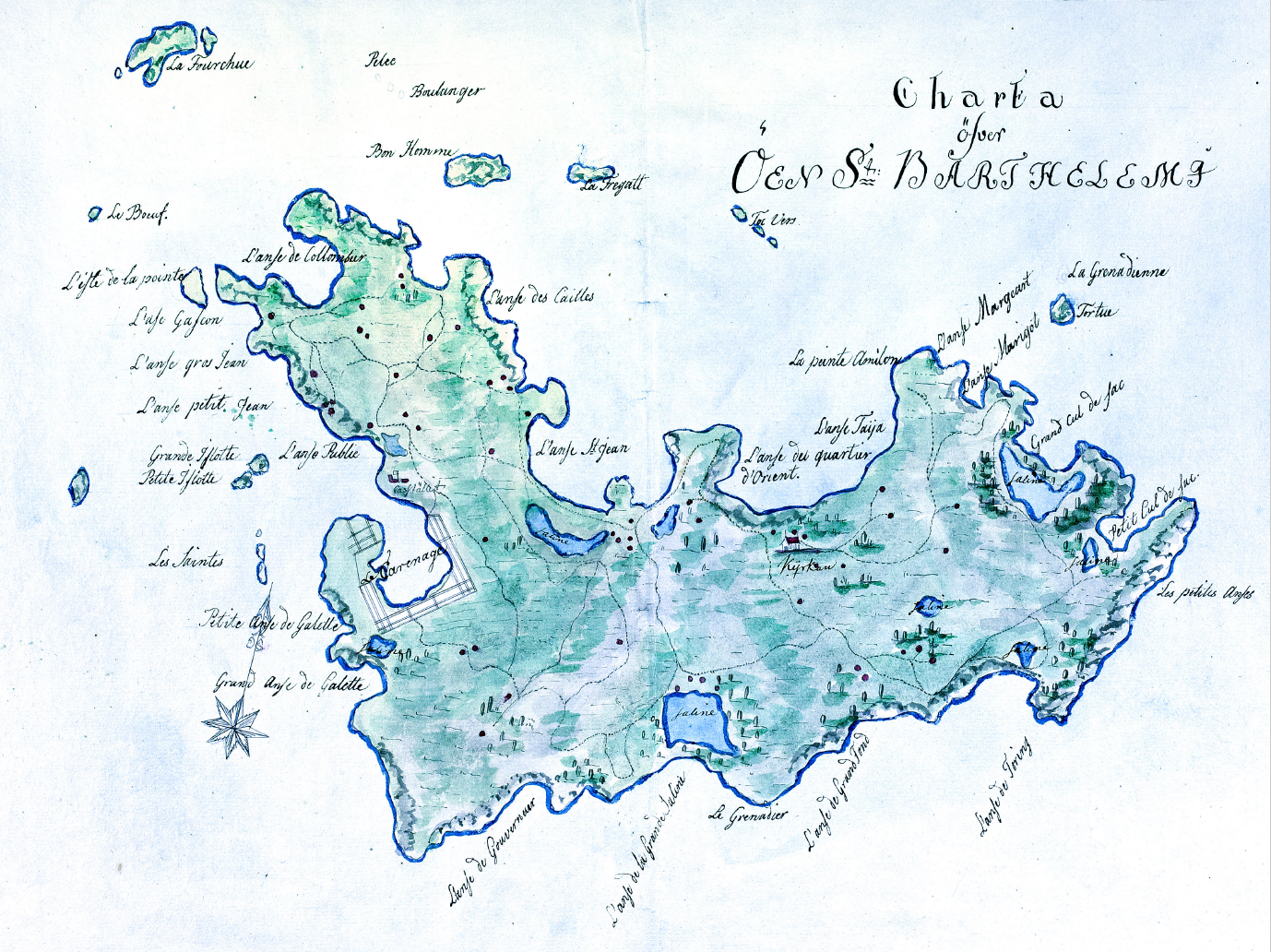Svensk karta över S:t Barthélemy från 1780-talet. Staden Gustavia hade ännu inte fått sitt namn utan har sitt franska namn, Le Carénage, kvar. Det som liknar sjöar är grunda dammar där man utvann salt från havsvattnet. Källa: Stiftsbiblioteket, Linköpings stadsbibliotek