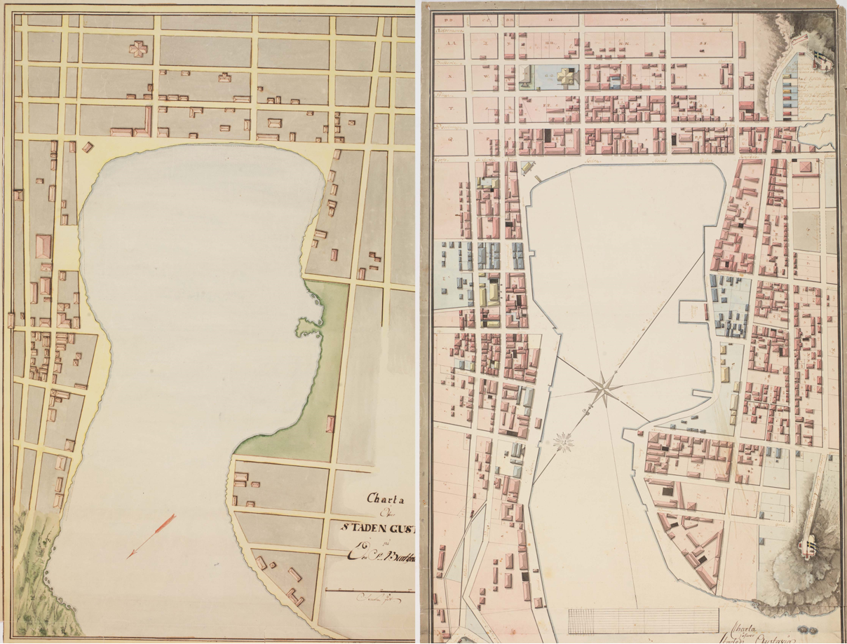 Staden Gustavia växte snabbt under decennierna kring år 1800. Den vänstra kartan är från ungefär 1790 och den högra från 1801.