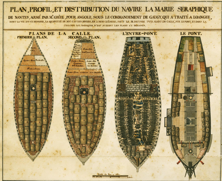 Lastutrymmen ombord på skeppet Marie-Séraphique. På de undre däcken lastades tunnor med vatten och mat som behövdes under resan från Afrika. Källa: Musée d’histoire de Nantes.