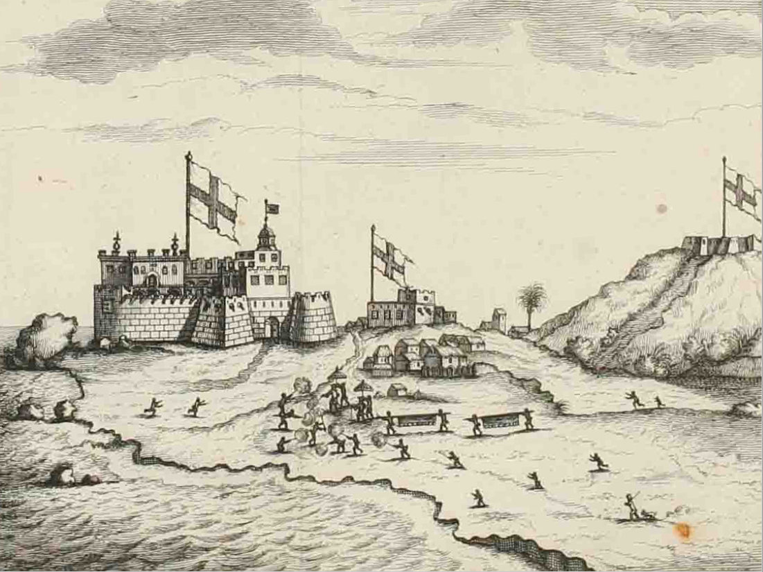 Handelsfortet vid Cabo Corso från havssidan. Bilden är från omkring år 1700 och visar det engelska fortet som byggdes på platsen för det svenska fortet. Bild: internetarchive.org