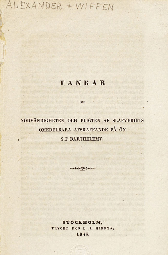 Titelsidan från en skrift som propagerade för slaveriets avskaffande på S:t Barthélemy. Författarna George William Alexander och Benjamin Barron Wiffen var brittiska slaverimotståndare.
