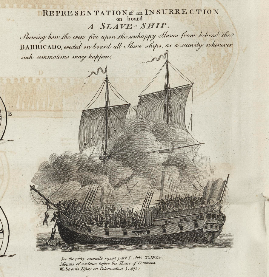 På senare år har forskning visat att det var ganska vanligt att fångarna gjorde uppror på skeppen. På bilden beskjuts fångarna av besättningen som står bakom ett plank på akterdäck. Enligt historien om just detta skepp skedde upproret vid kusten i det som idag är Sierra Leone i Västafrika. Upproret misslyckades och ledaren avrättades direkt genom hängning.