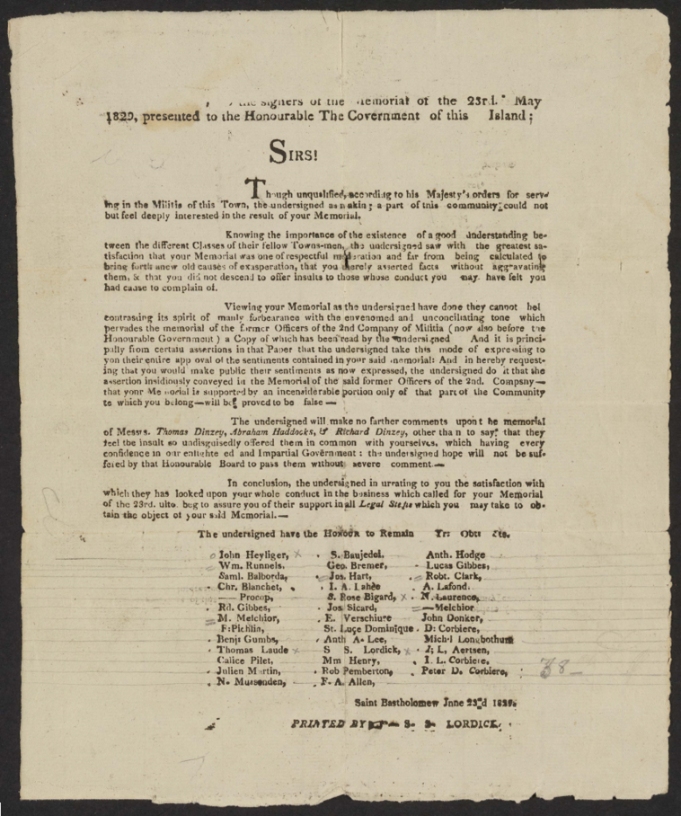 Fria svarta män började organisera sig på 1810-talet. De krävde samma medborgerliga rättigheter som den vita befolkningen. Slavlagarna gällde både för de förslavade och de fria svarta. Grupper av fria svarta män skrev flera gånger till myndigheterna för att kräva en rättvisare behandling. En gång vände de sig direkt till kungen i Stockholm. De skrev då på franska eftersom det var kung Carl XIV Johans modersmål.