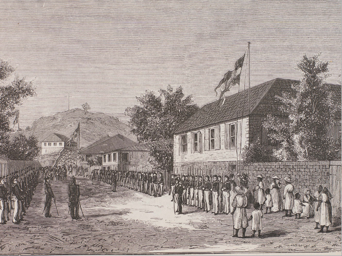 Den 16 mars 1878 skedde återlämnandet av den svenska kolonin till Frankrike vid en ceremoni i Gustavia. Bildkälla: Ny Illustrerad Tidning 1878
