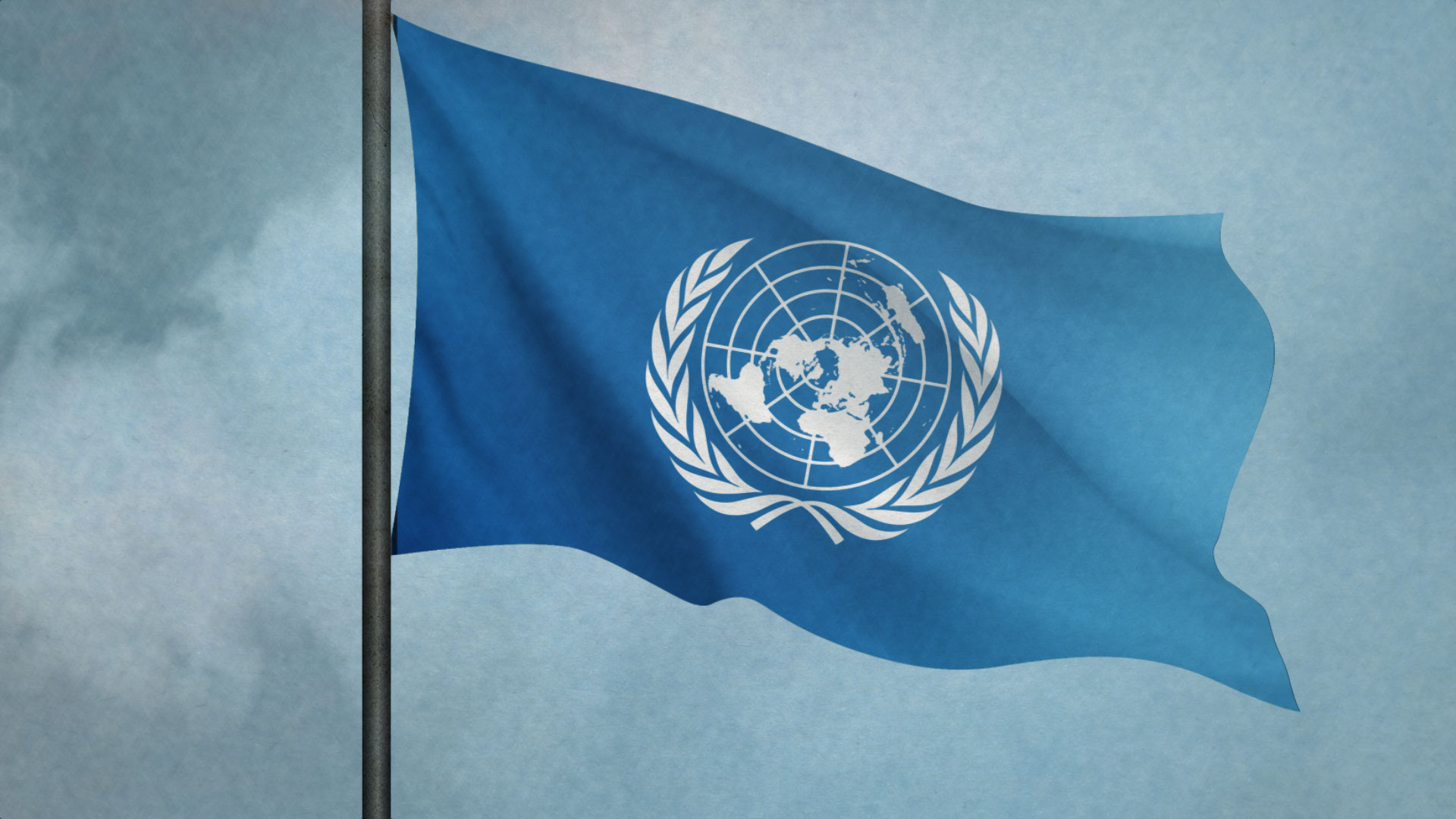 Illustration med Förenta nationernas blåvita flagga mot en en molnig himmel.