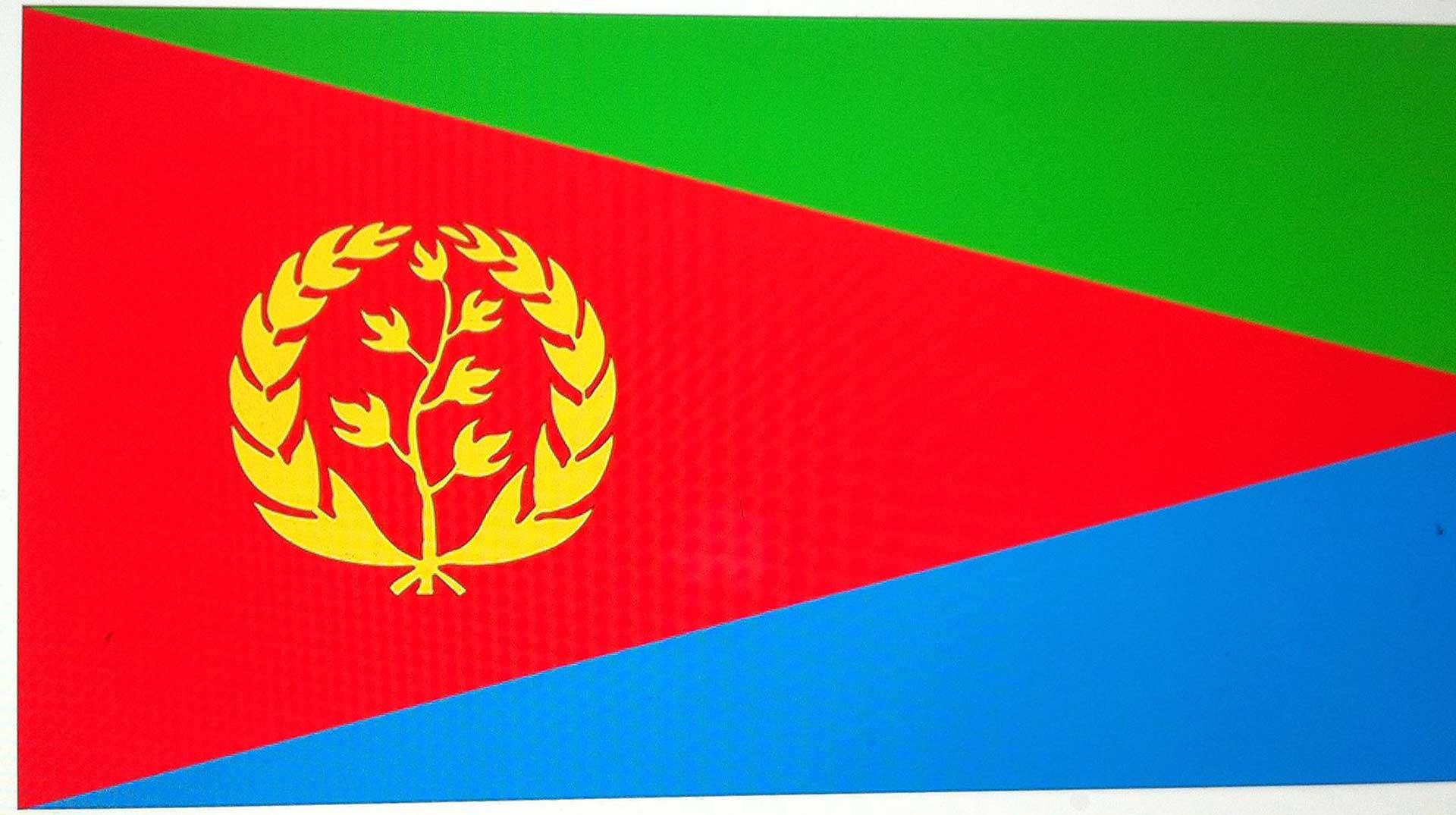 Denna flagga representerar Eritrea och är dess officiella flagga. Den gröna delen symboliserar Eritreas jordbruks- och boskapsekonomi. Det röda står för blodet som utgjutits under Eritreas kamp för självständighet. Den blå delen representerar den marina rikedomen, och den gula mineralrikedomen. Olivkransen på flaggan kommer från Eritreas första nationella flagga som användes mellan 1952 och 1959, som symboliserar fred. Foto: Wikimedia Commons